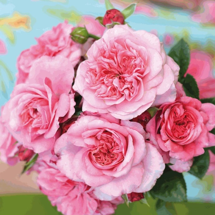 Ses boutons roses foncés s'épanouissent en une grande fleur turbinée d'environ 8cm d'un rose tendre au parfum intense aux notes orientales.